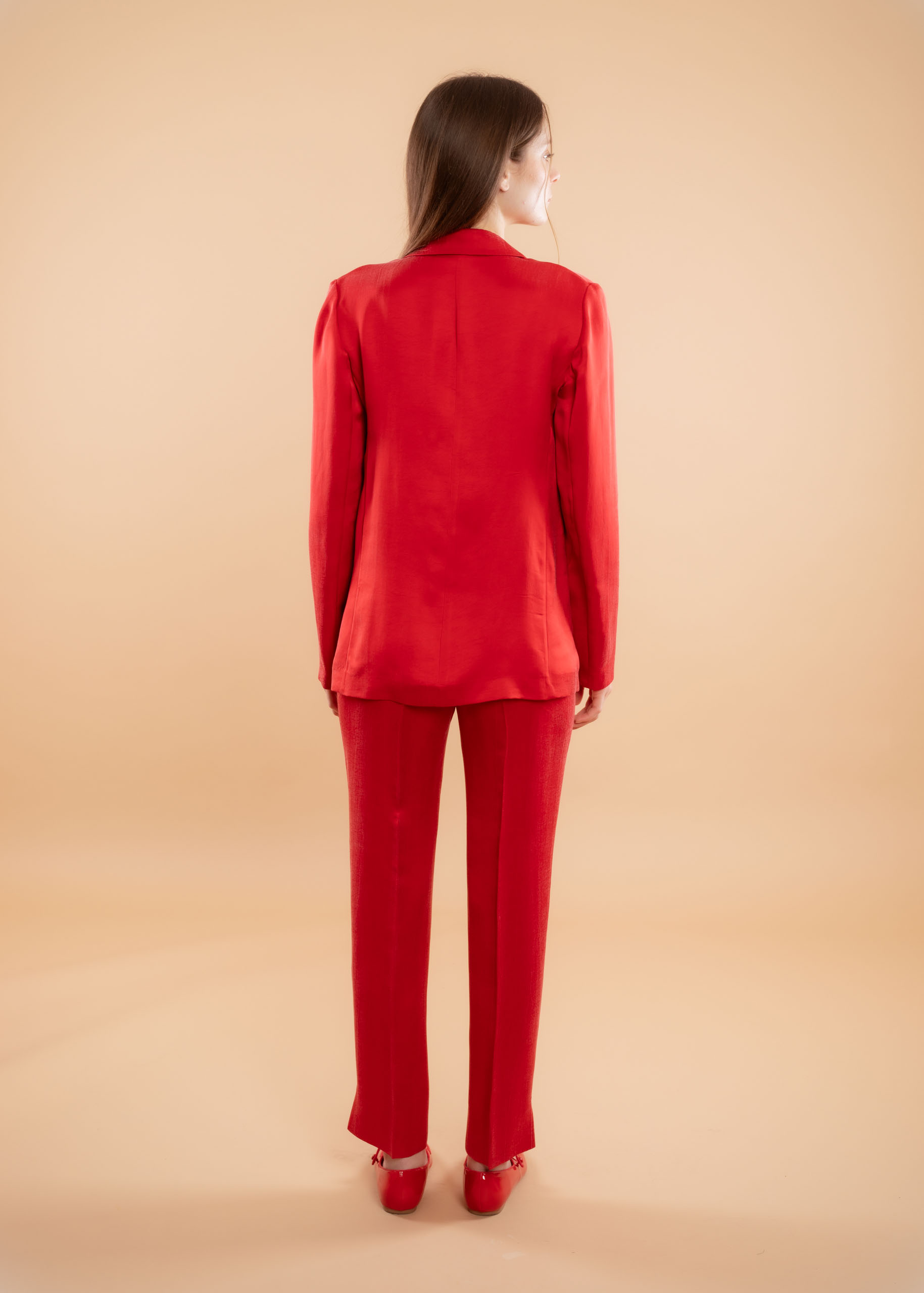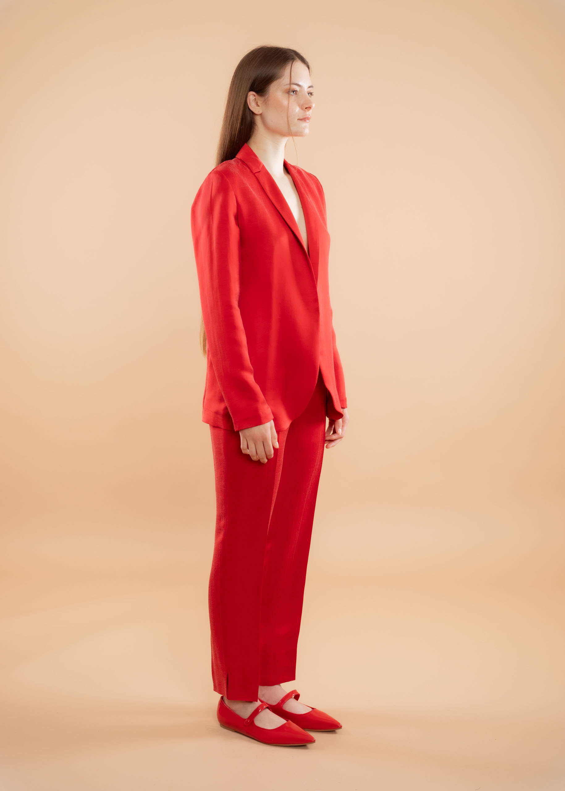 Revers classico, chiusura frontale senza bottoni, taglio sartoriale e maniche lunghe.